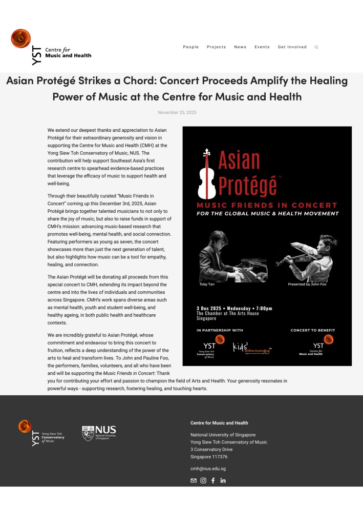 Proceeds of this concert will benefit the Centre for Music and Health (CMH) at the Yong Siew Toh Conservatory of Music(YST), National University of Singapore.